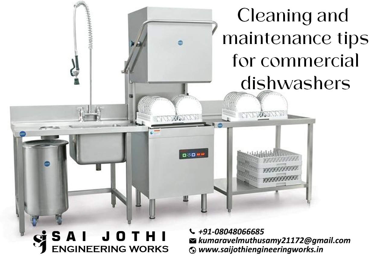 Cleaning and maintenance tips for commercial dishwashers/Cleaning of commercial dishwashers/ Commercial dishwasher maintenance checklist/How to clean commercial dishwasher/How to use commercial dishwasher/Commercial kitchen equipment insurance/Commercial Kitchen Appliances/ Best Commercial Kitchen appliances/ Best commercial equipment manufacturing in Coimbatore/ Best commercial kitchen appliances manufacturer in Coimbatore. Clean the filters - Regularly clean the filters of your commercial dishwasher. This is important to ensure that the dishwasher is running efficiently and that dishes are being properly washed. Use the right detergent - Make sure to use the correct detergent for your commercial dishwasher. This will help ensure that dishes are properly washed and that the dishwasher is running at its peak performance. Sanitize the dishwasher - Regularly sanitize the dishwasher to make sure that dishes are being properly washed and that bacteria and other germs are not being spread. Check the water quality - Make sure to check the quality of the water being used in the dishwasher. This will help ensure that dishes are being properly washed and that the dishwasher is running at its peak performance. Inspect the hoses - Make sure to inspect the hoses of your commercial dishwasher regularly. This will help to make sure that the hoses are not leaking or clogged and that the dishwasher is running at its peak performance. Clean the exterior - Make sure to regularly clean the exterior of your commercial dishwasher. If you are looking for commercial kitchen equipment for your South Indian Restaurant, you can explore a wide range of advanced equipment with Sai Jothi engineering works. If you want to buy the best quality commercial kitchen equipment such as wet grinders, blender machines, potato peeling machines, tabletop grinders, etc. Do contact Sai Jothi Engineering works in Coimbatore. Also, motor open well pump, coconut scraper, sugarcane machine, shawarma-making machine, garlic grinding machine, machine spares, chicken killing cone, oil dryer, chicken scalder machine, and atta kneader are provided by Sai Jothi engineering works.